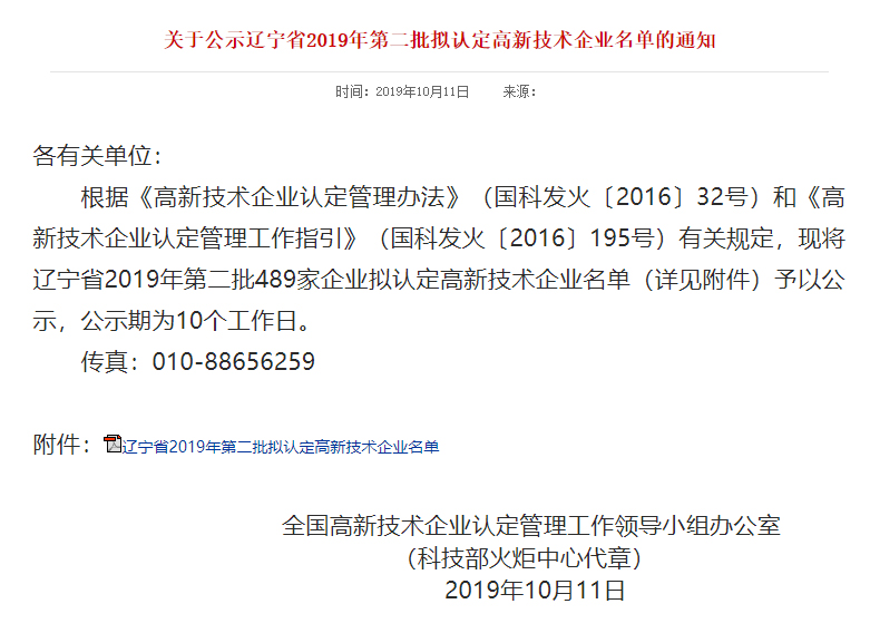 我公司進入遼寧省第二批擬認定高新技術(shù)企業(yè)名單